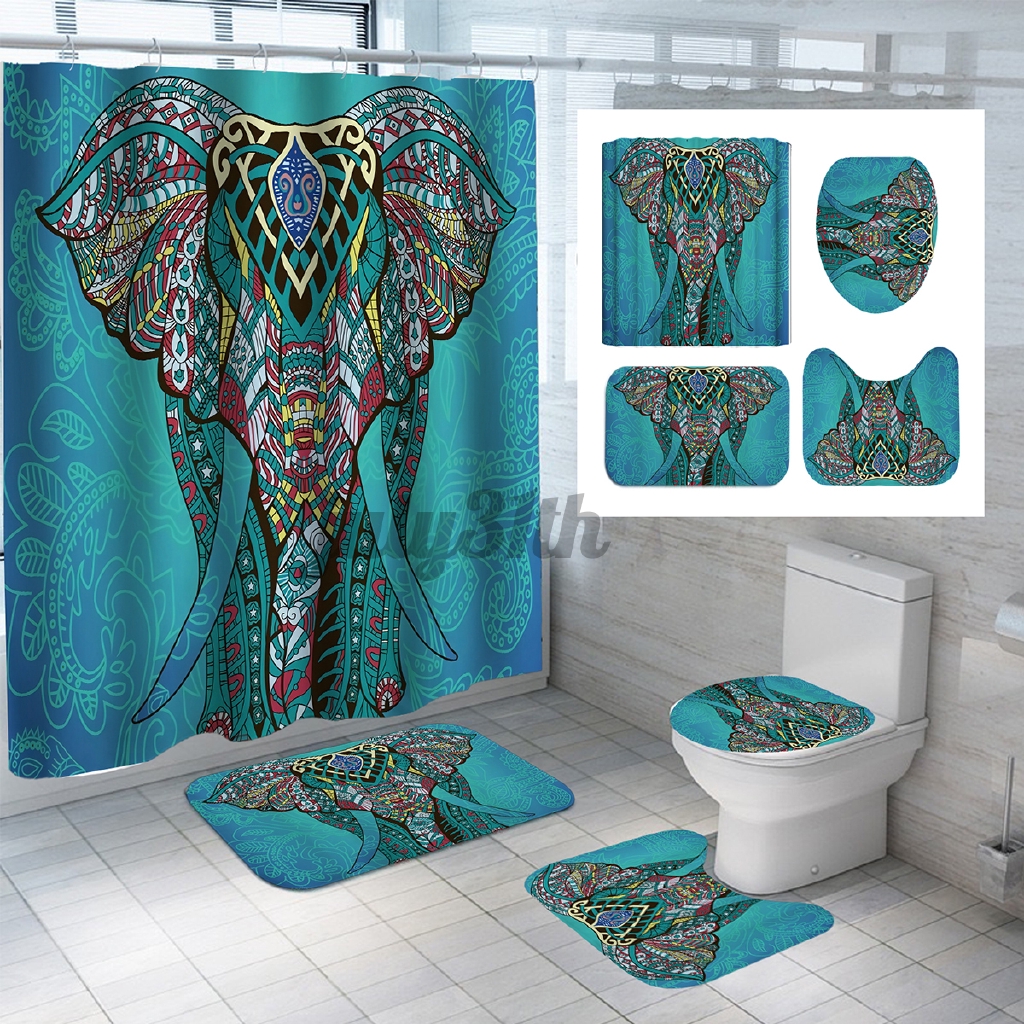 Elephant Bathroom Set Shower Curtain Non Slip Bath Mats Toilet